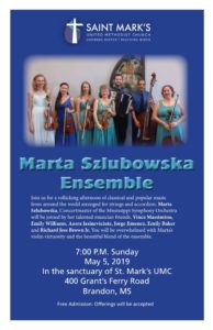 « All Events This event has passed. Marta Szlubowska Ensemble at St. Mark’s Episcopal Church in Brandon May 5, 2019 @ 7:00 pm - 8:30 pm CDT free, donations accepted « MSO’s Chamber 4, Schubert’s Death and the Maiden Quartet and more Annual Pepsi Pops, MSO on the Reservoir! » Add to calendar Google Calendar iCalendar Outlook 365 Outlook Live Details Date: May 5, 2019 Time: 7:00 pm - 8:30 pm CDT Cost: free, donations accepted Venue St. Mark’s Episcopal Church, Brandon, MS Brandon, MS United States + Google Map